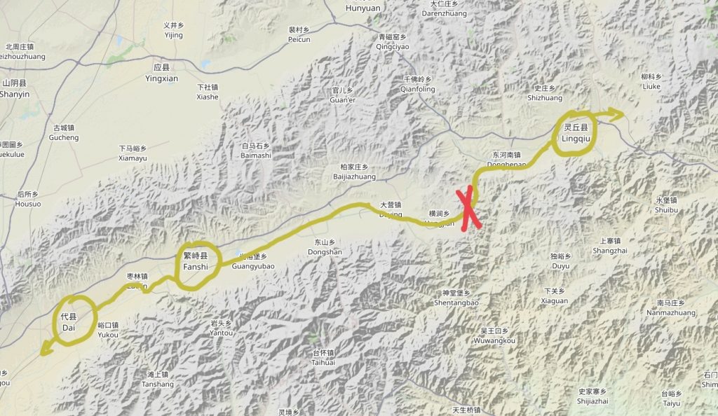 平型关站附近地形,可见进入关内后即可长驱直入进入山西省中部,再无关隘和天险