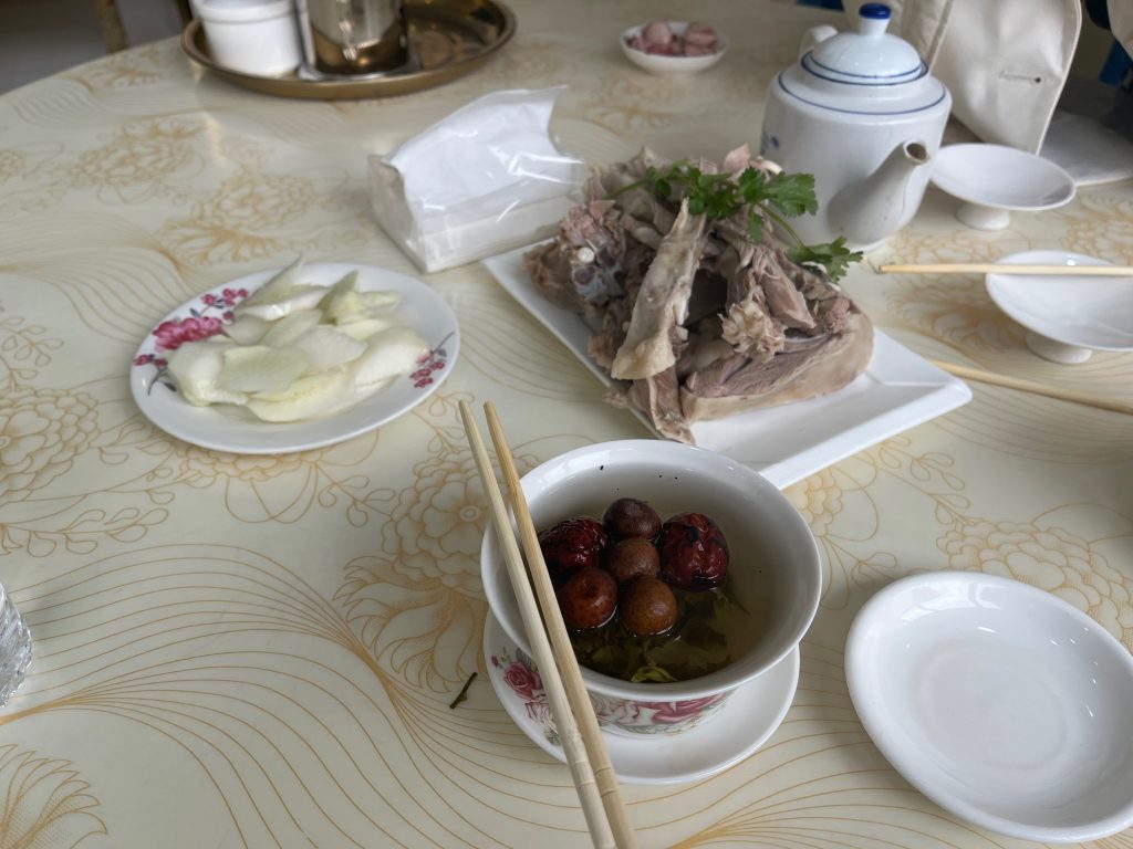 但这里并不是一个无聊的地方,首先这里的手抓羊肉堪称一绝,这边管吃手抓羊肉的店叫”手抓城“,”城“这个称呼就很霸气,让人直接联想到品种琳琅满目的美食城(但事实并非如此,手抓主打一个极简主义),临夏州下辖的东乡族自治县,主街上更是清一色的”手抓城“。手抓的吃法,大概是羊肉蘸醋,配上一杯三炮台和一叠酸萝卜,再来一碗面片当主食,味道鲜美无比。手抓羊肉一般就三个部位,脖子,肋条和前腱,价格基本在55-60一斤左右,我一个人单挑一斤完全没有问题。再者,Downtown里除了清真寺就是卖牛羊肉的奶制品的店。肉价大多在45-50一斤,酸奶的话,两三块钱买一杯就可以边走边吃。
