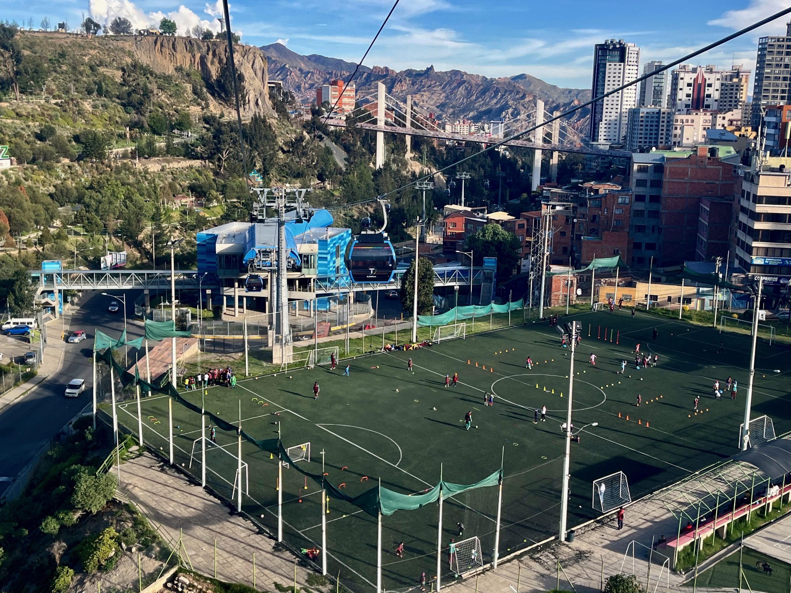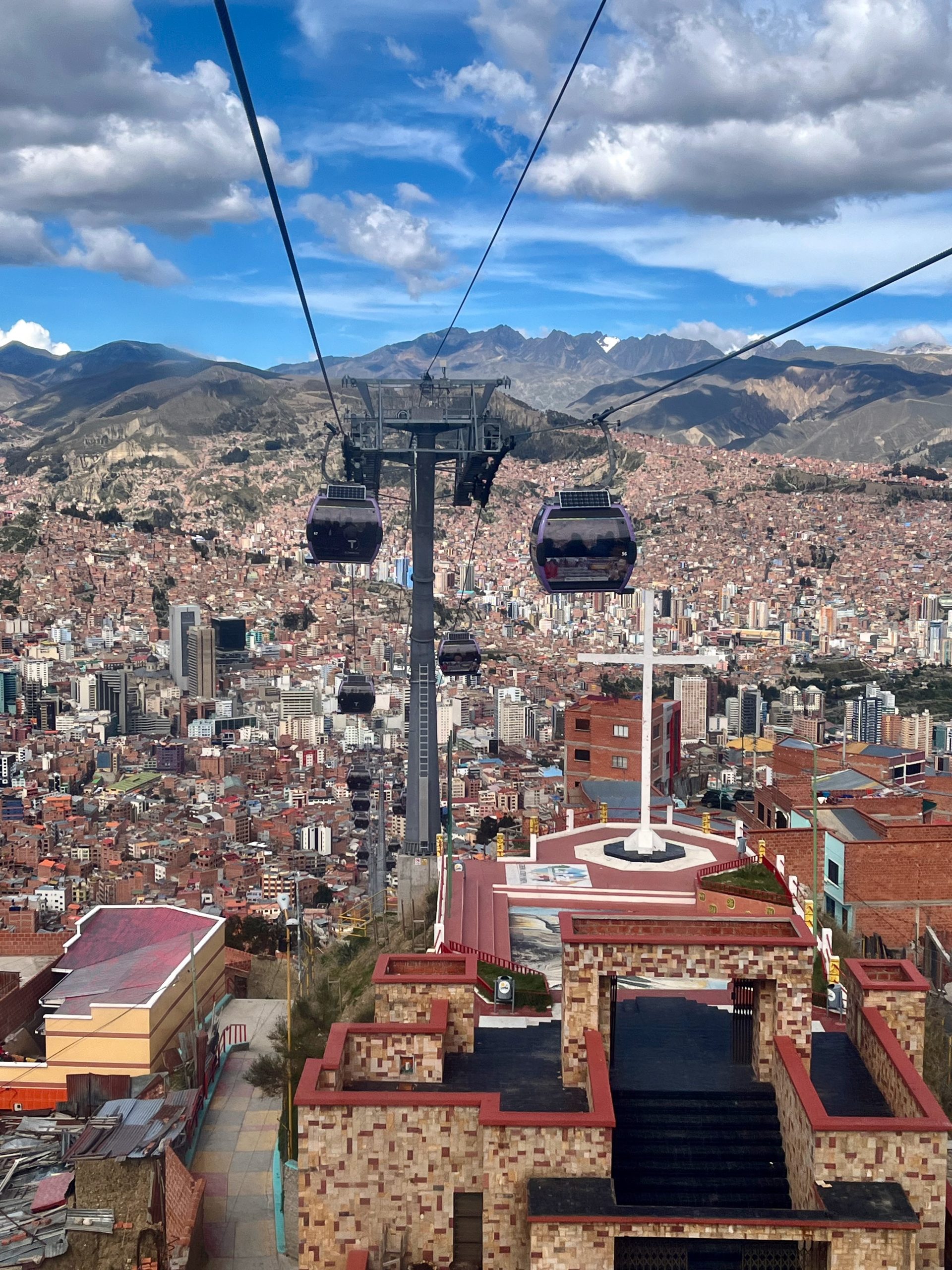 但交通的奇妙性不止于此,城市中悬殊的落差催生出了更奇妙的通勤方式——缆车。虽然其他建在高原上的拉美城市多少也有缆车,但在这里缆车甚至已经成为了公共交通主力。拥有11条线路,9个换乘站,总长共34km,这里的人坐缆车,就像大城市坐地铁一样普遍。单程约3块钱人民币,乘坐舒适,没有堵车,缆车硬生生地把高速公路上下山小巴卷到了2块钱一人。作为游客的我,坐在都市缆车自由飞行于楼房、球场、市场与车站之上,一边抬头望着远处宁静的雪山,一边低头看着这充满活力、毫不宁静的拉美天空之城,已经被它的魅力所折服。