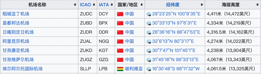 世界机场海拔排名